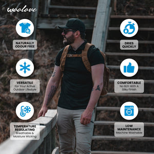 Breathable and moisture wicking, and its natural thermoregulating properties, Merino Wool will help regulate your body temperature, keeping you cool in the summer and warm in the winter, so you stay dry and comfortable. Plus its anti-microbial which means it will remain odour-free even after multiple consecutive wears.