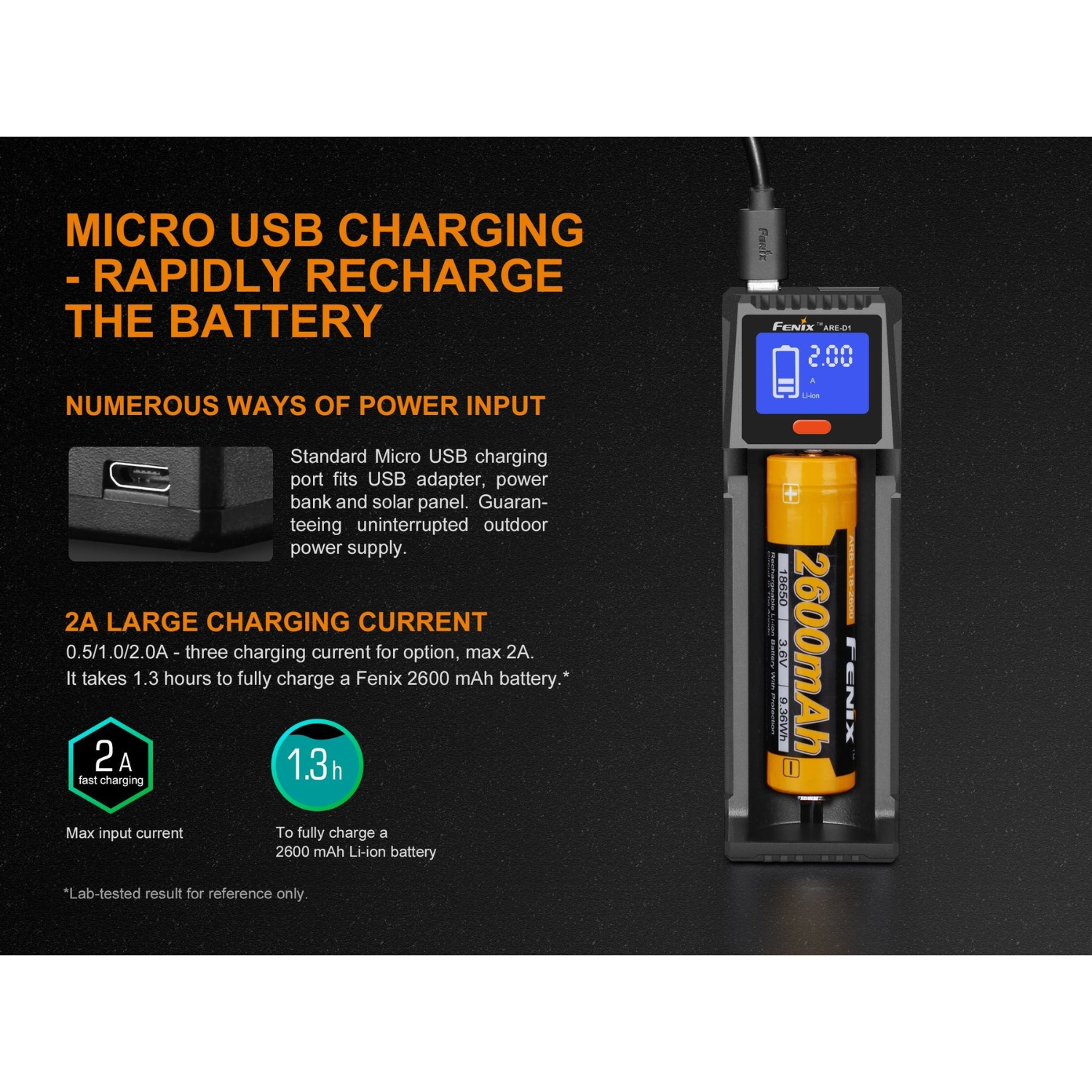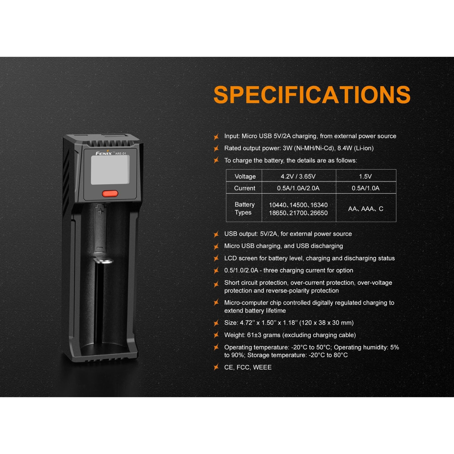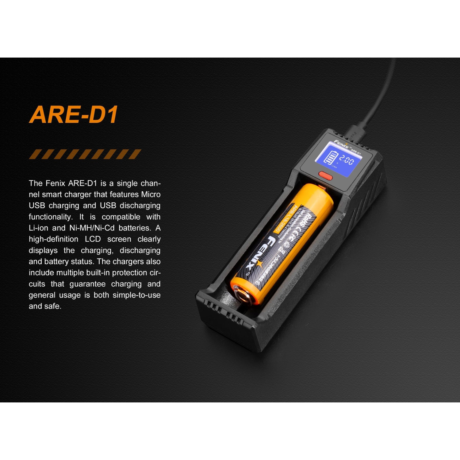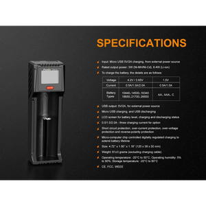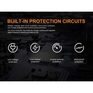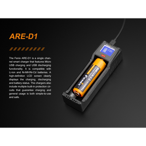 You can safely charge all your Fenix batteries with the four tiers of protection including short circuit, over-current, over-voltage, and reverse-polarity protection. Battery life is extended thanks to the micro-computer chip inside the ARE-D1 charger that controls and regulates digital charging.
