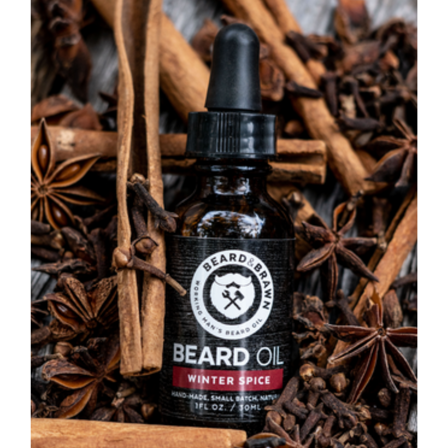 - Winter Spice - Don't let the name fool you, this is not just a winter beard oil. Made to work hard for your beard the whole year round. It's just a bonus that it smells like Christmas!. Ingredients - Sweet Almond, Grape Seed, Jojoba, Argan, Avocado, Castor and Coconut carrier oils. Peppermint, Long Leaf Pine, Frankincense and Myrrh essential oils.