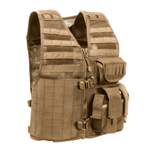 This MOLLE gear vest also has a pistol magazine pouch and a utility pouch. The opposite chest panel has full MOLLE coverage allowing the user to add modular holsters and pouches and tailor the vest to their needs. The back panel is also a full-MOLLE panel with a reinforced drag handle and hydration sleeve. This tactical vest with mag pouches is available in right and versions.