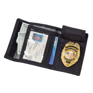 This tri-fold slim badge wallet is constructed out of 1000 denier nylon and has a hook and loop closure. One large compartment for bills, card pockets, interior ID window and badge holder with cover.