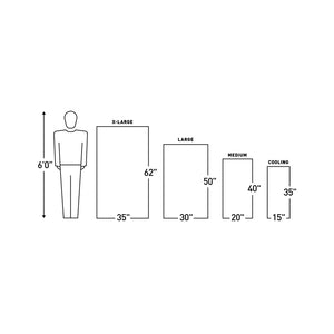 - Towel sizes are medium (20” x 40”), large (30”x50”) and (35”x62”) XL