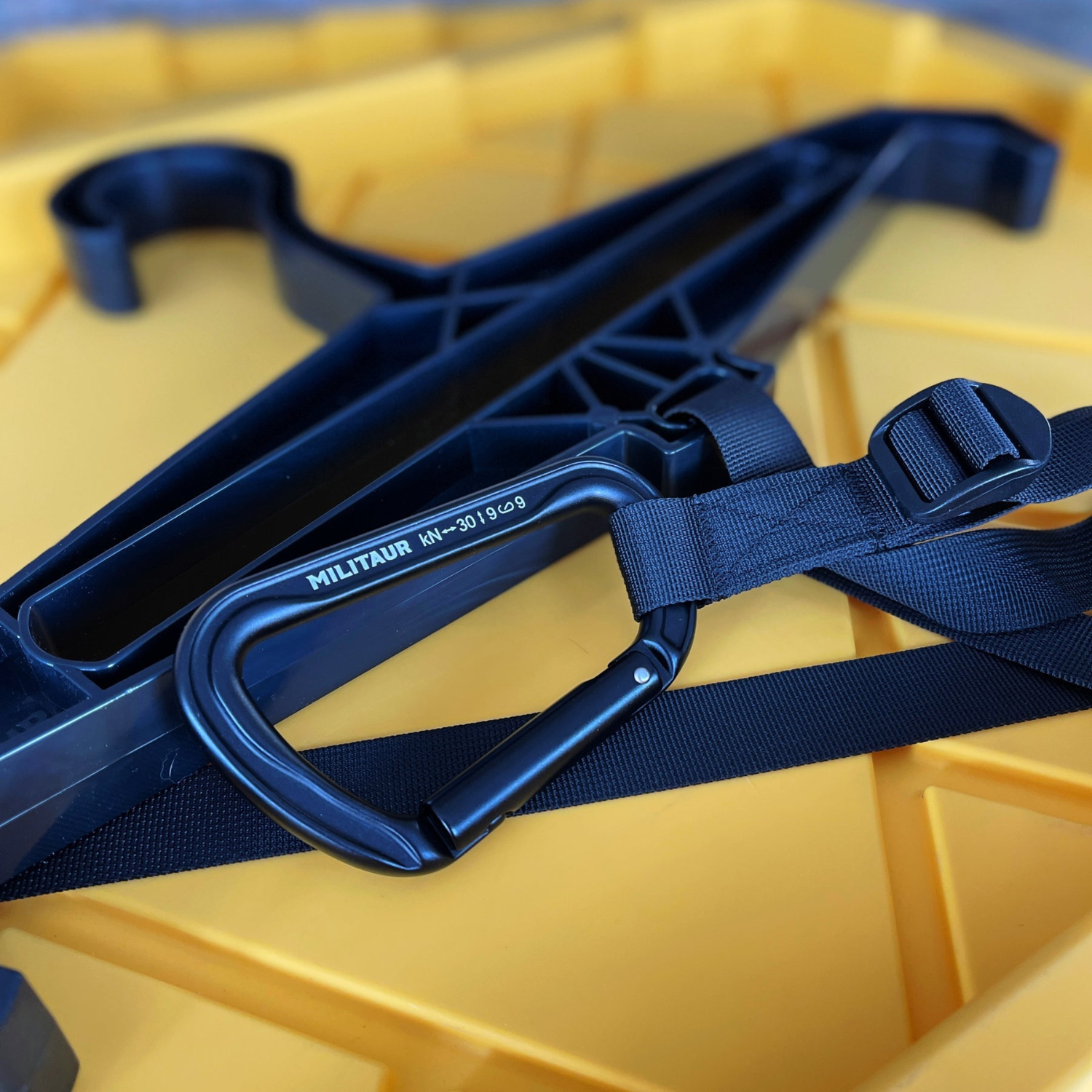 The MILITAUR Hanger was lab tested at 80kg (hold up to approx. 175lbs) and designed to support your gear. 30kN high quality aluminum Carabiner.