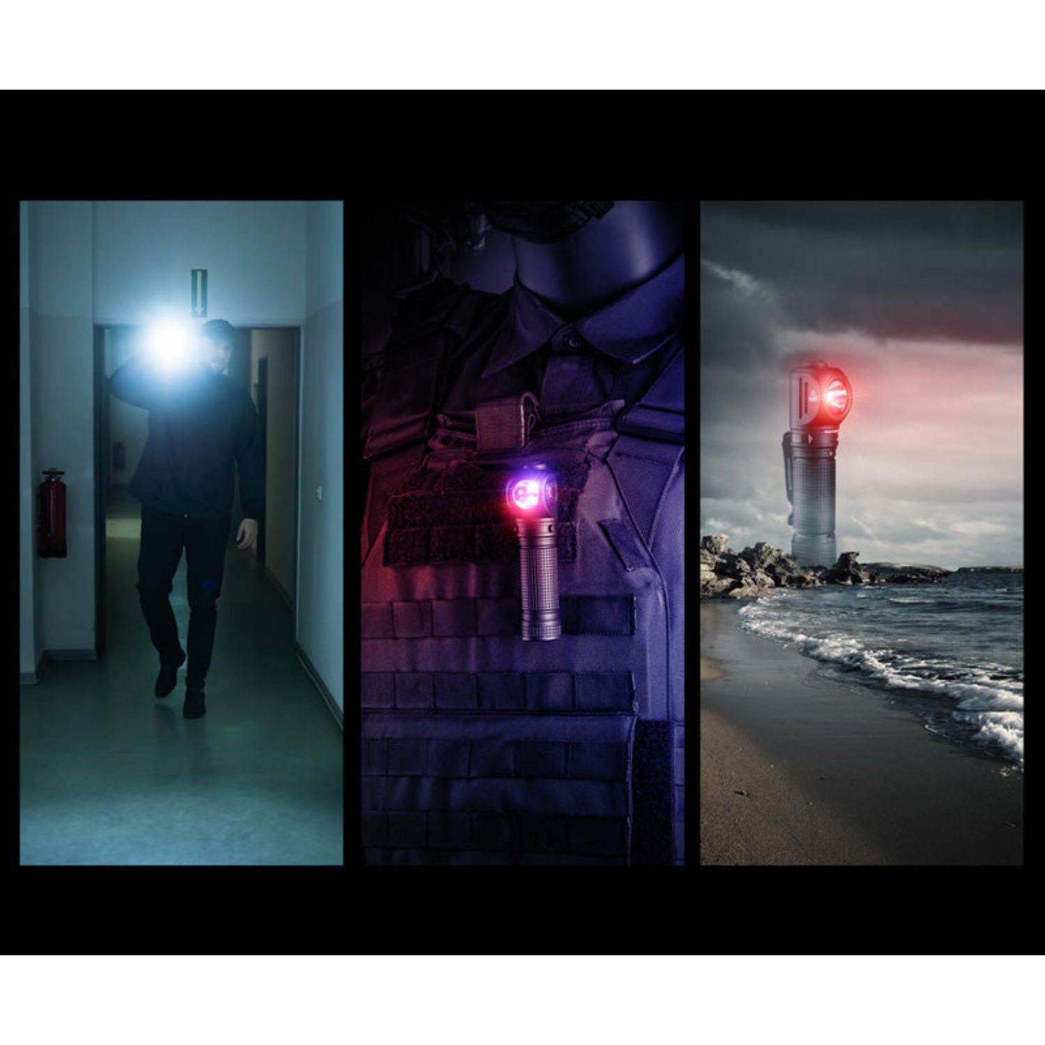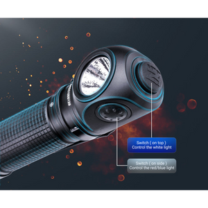 The side button controls the red and blue light, with a long press activating the red/blue signal mode.
