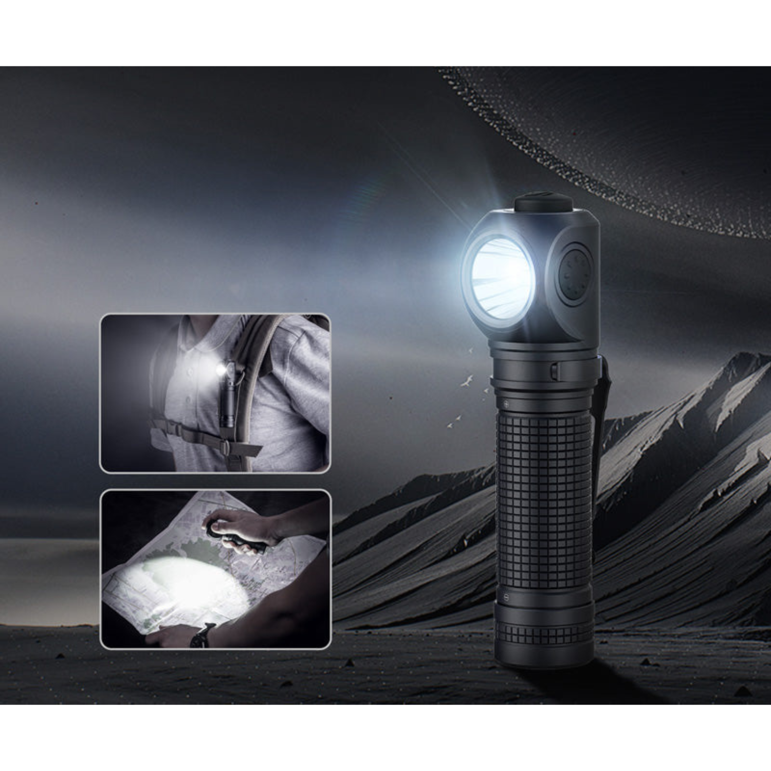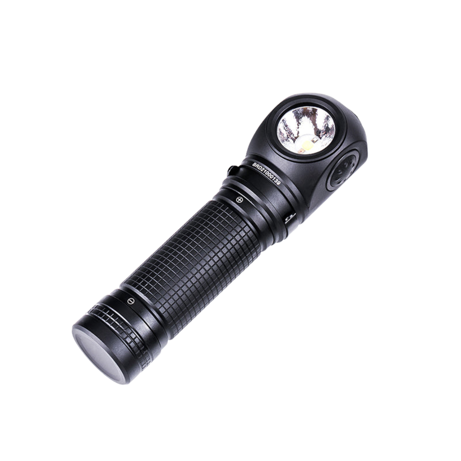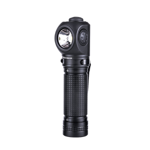 The top button controls the white light, with a full-press activating constant-on and a half-press toggling through brightness levels.