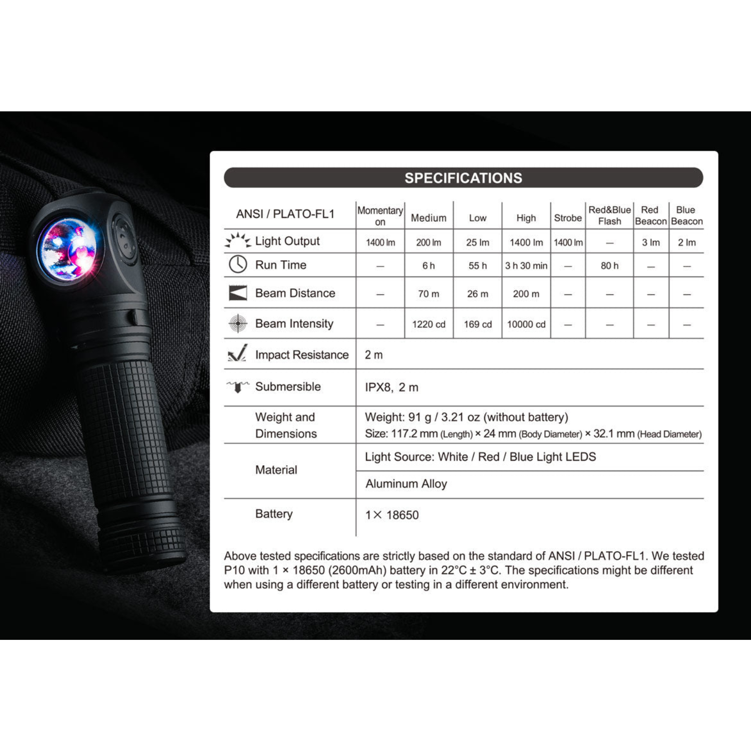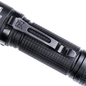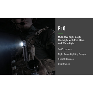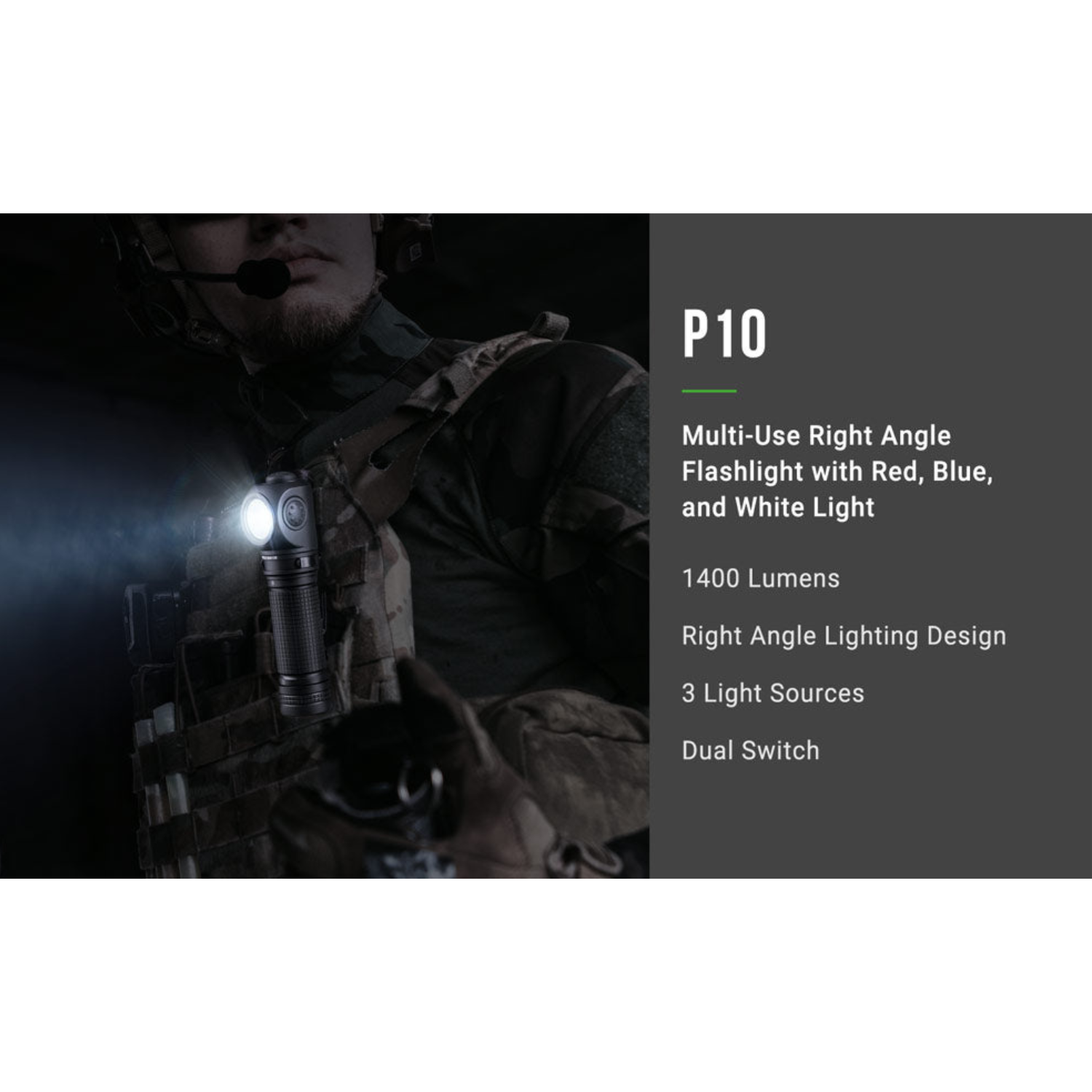 The included stainless steel clip allows the P10 to attach to MOLLE or clip to a pocket, and the flat tail makes it easy to stand upright.