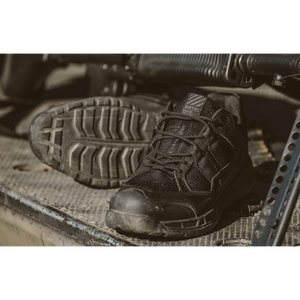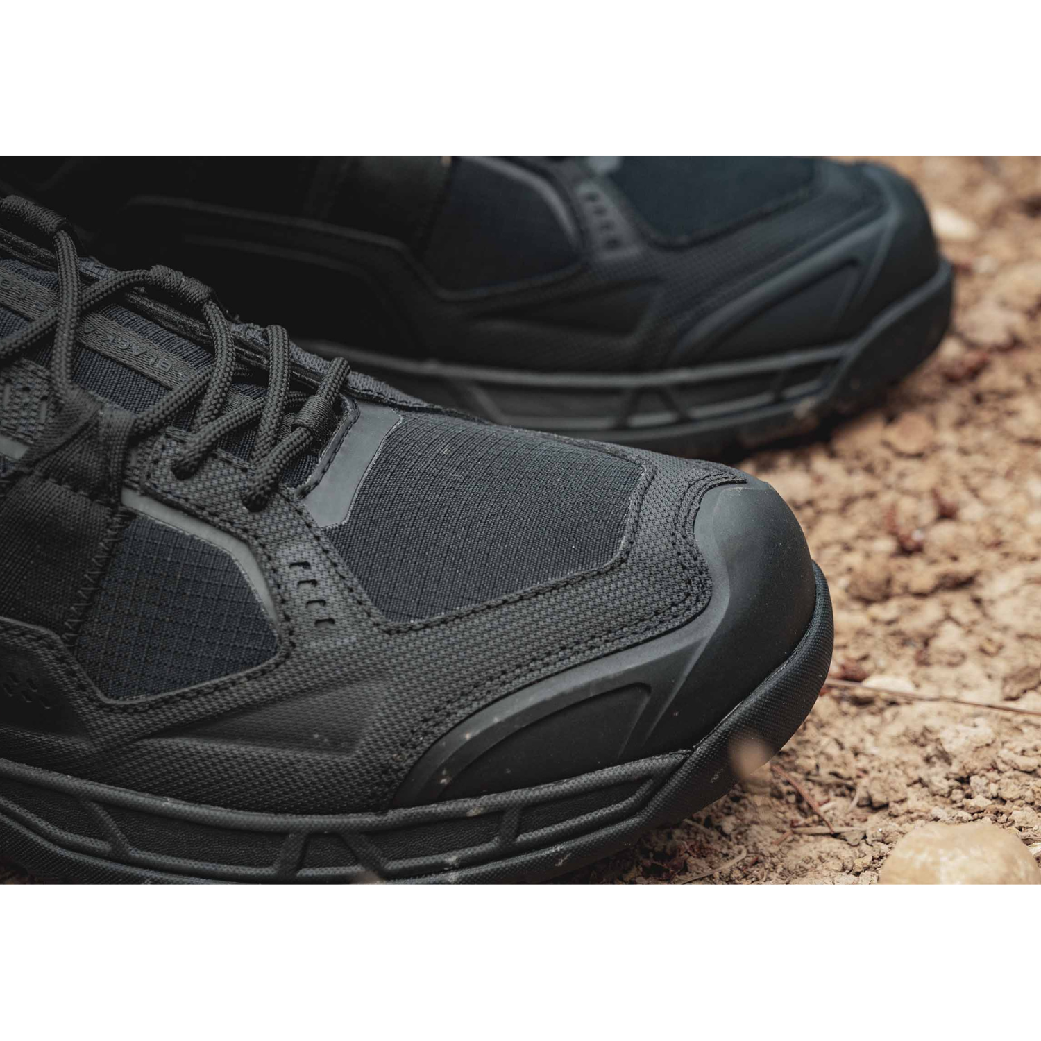 The chassis is constructed of waterproof/breathable nylon ripstop with synthetic overlays and a molded TPU toe for tactical reinforcement.