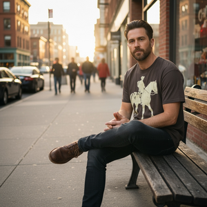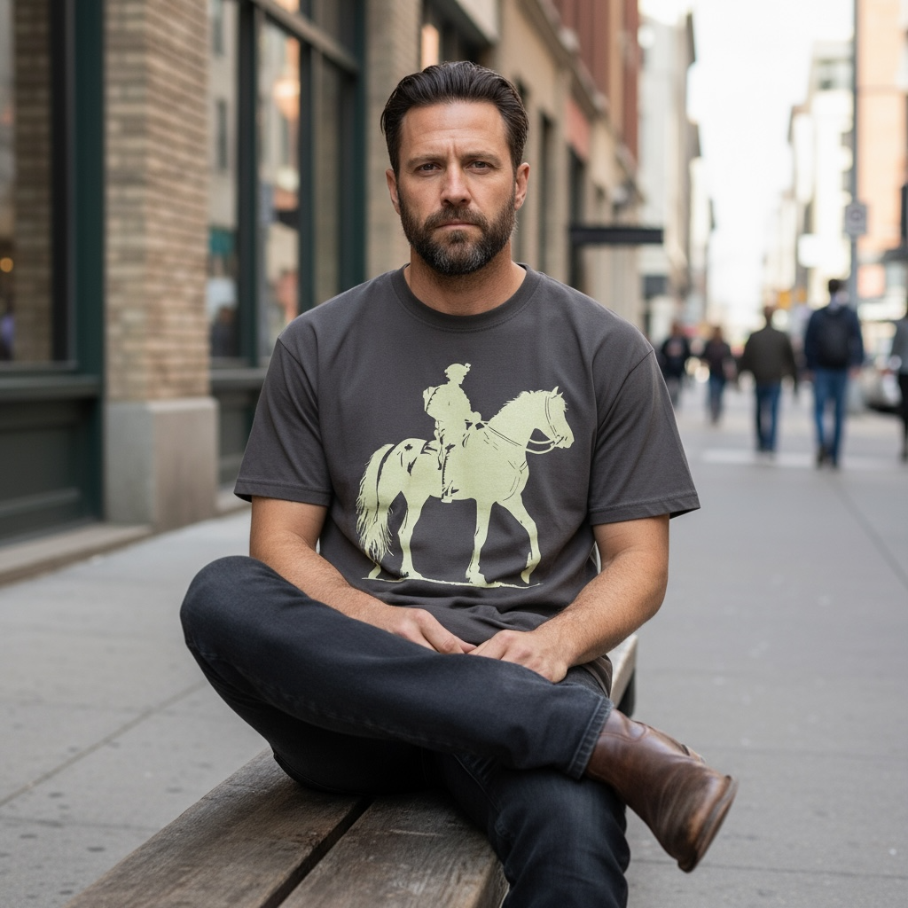 The bold front graphic features a lone mounted rider, a timeless symbol of courage, vigilance, and quiet strength attributes shared by the Veterans and First Responders this shirt supports.