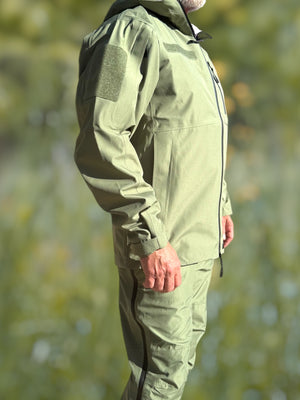 Advanced 3-layer laminate uniting silent movement, complete waterproofing, windproof protection, and breathable comfort in a streamlined duty cut.