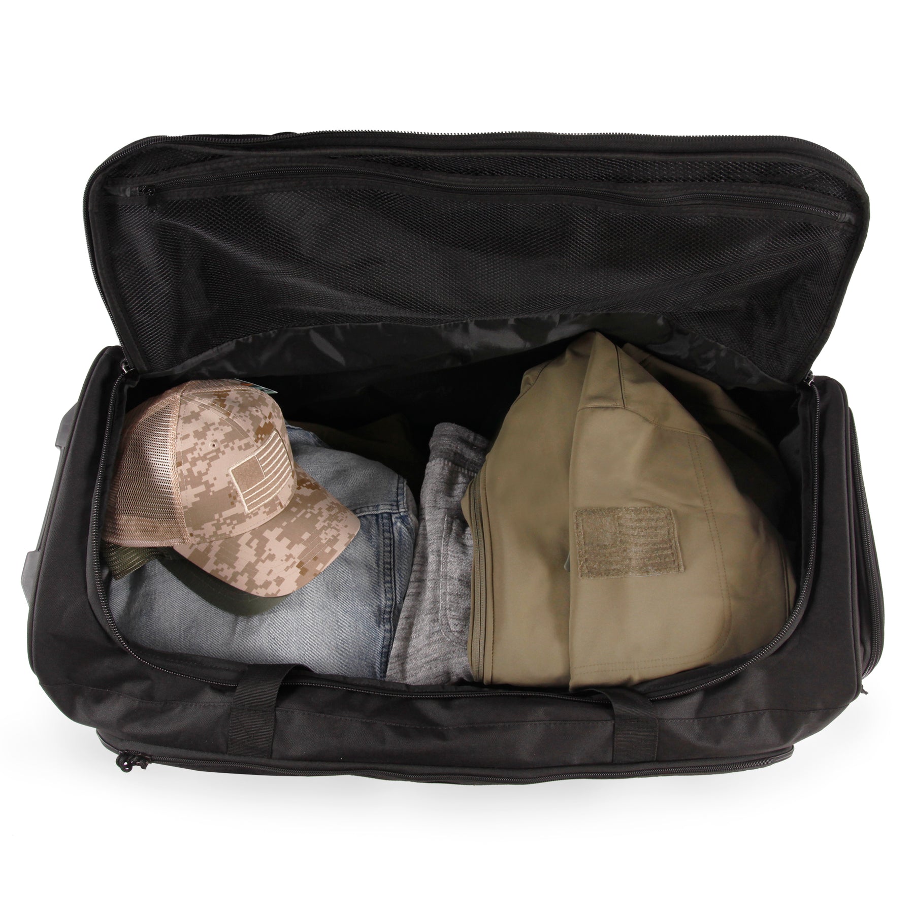 Boasting a 30" length for to maximize your storage needs, whether your packing for a trip or a day at the range. The bungee strap on top allows you to secure extra gear and loose clothing with easy access. The front pocket provides quick access and gives you a lot of additional storage to organize your accessories. The recessed in-line wheel system allows for smooth travel on rugged terrain, while the reinforced internal handle system allows for easy maneuvering.