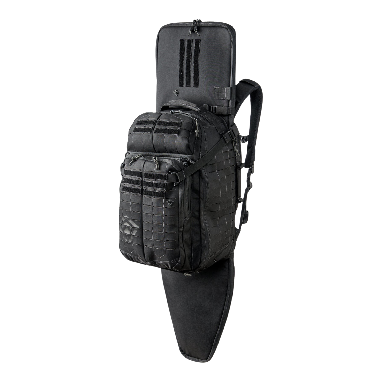 The inclusion of an ingenious Hook and Hang Thru™ System compartment unzips top and bottom, allowing specialized items like First Tactical Rifle Sleeves or other oversized tactical gear or hanging items to slide through and securely hook & hang in place.
