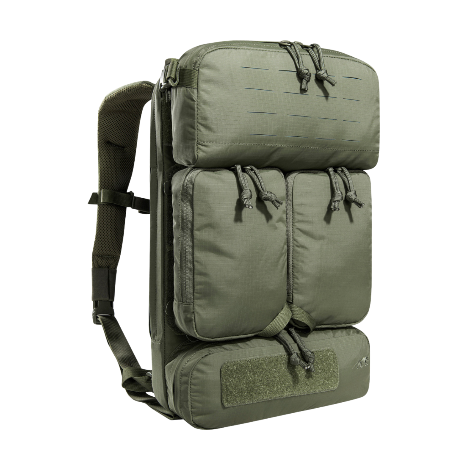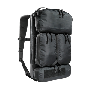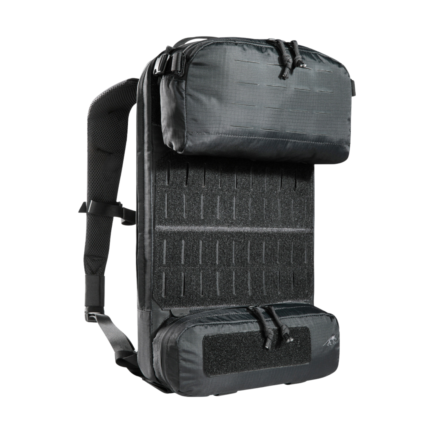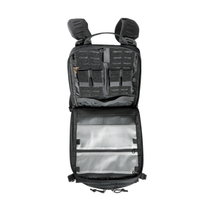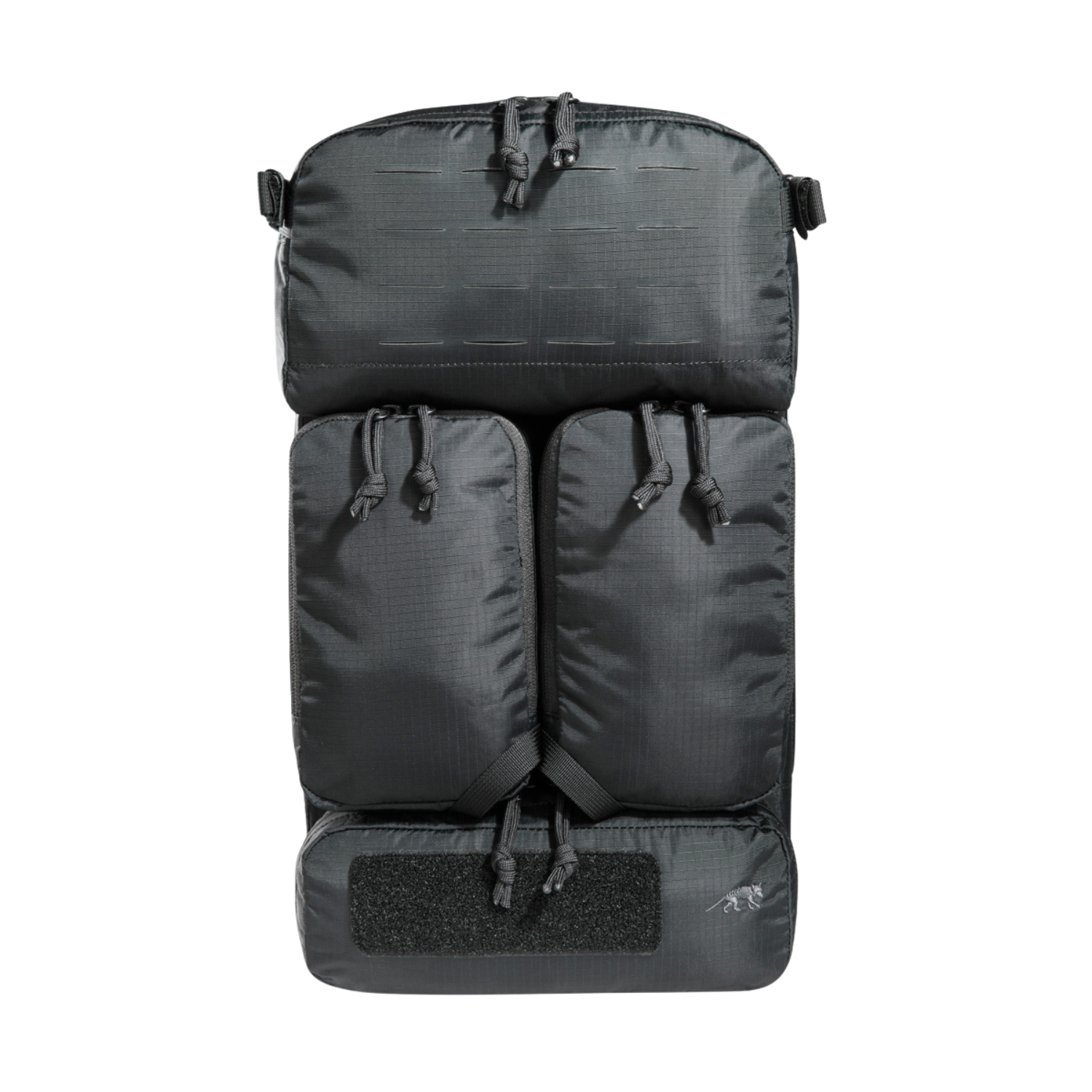 The materials used for this deployment backpack are very light, making it super easy to handle. It has a flat main compartment that is hydration system compatible and the back panel is fitted with MOLLE hook-and-loop for customizable loading of your gear. The upper front pocket of the backpack is a flip-top behind which you can attach a magazine holder (three M4 magazines or 4 pistol / MP7 magazines, included with purchase). Both middle front pockets are removable and behind each is a MOLLE hook-and-loop surface. Both the TT Tac Pouch 12 (item 7862) or the TT 2 SGL Backup Mag Pouch M4 (item 7811) can be attached to the lower front pocket. The backpack has a MOLLE reverse system on the back so you can integrate it into a plate carrier. You can also use an adapter to attach it to plate carriers.