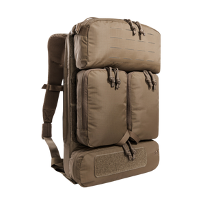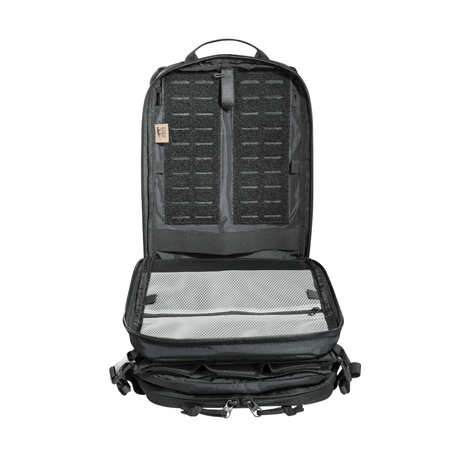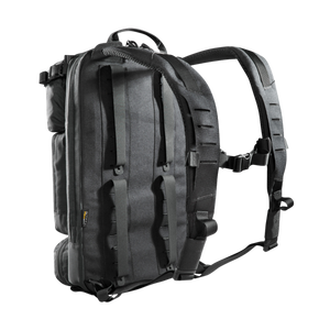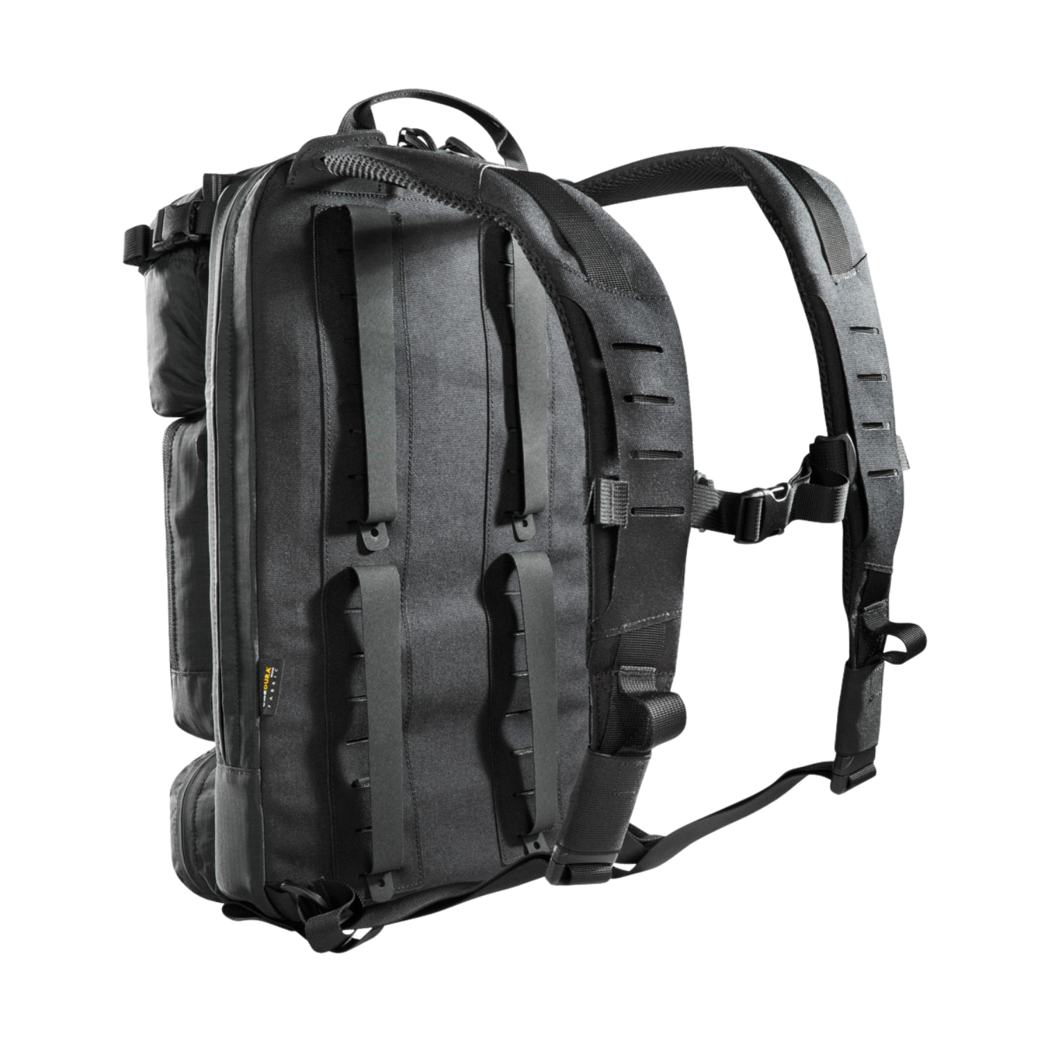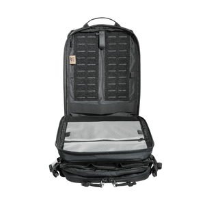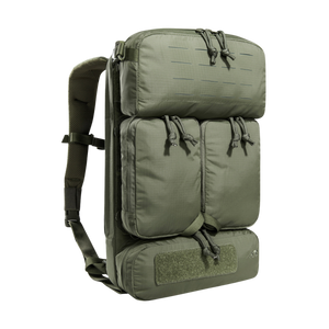 The materials used for this deployment backpack are very light, making it super easy to handle. It has a flat main compartment that is hydration system compatible and the back panel is fitted with MOLLE hook-and-loop for customizable loading of your gear. The upper front pocket of the backpack is a flip-top behind which you can attach a magazine holder (three M4 magazines or 4 pistol / MP7 magazines, included with purchase). Both middle front pockets are removable and behind each is a MOLLE hook-and-loop surface. Both the TT Tac Pouch 12 (item 7862) or the TT 2 SGL Backup Mag Pouch M4 (item 7811) can be attached to the lower front pocket. The backpack has a MOLLE reverse system on the back so you can integrate it into a plate carrier. You can also use an adapter to attach it to plate carriers.