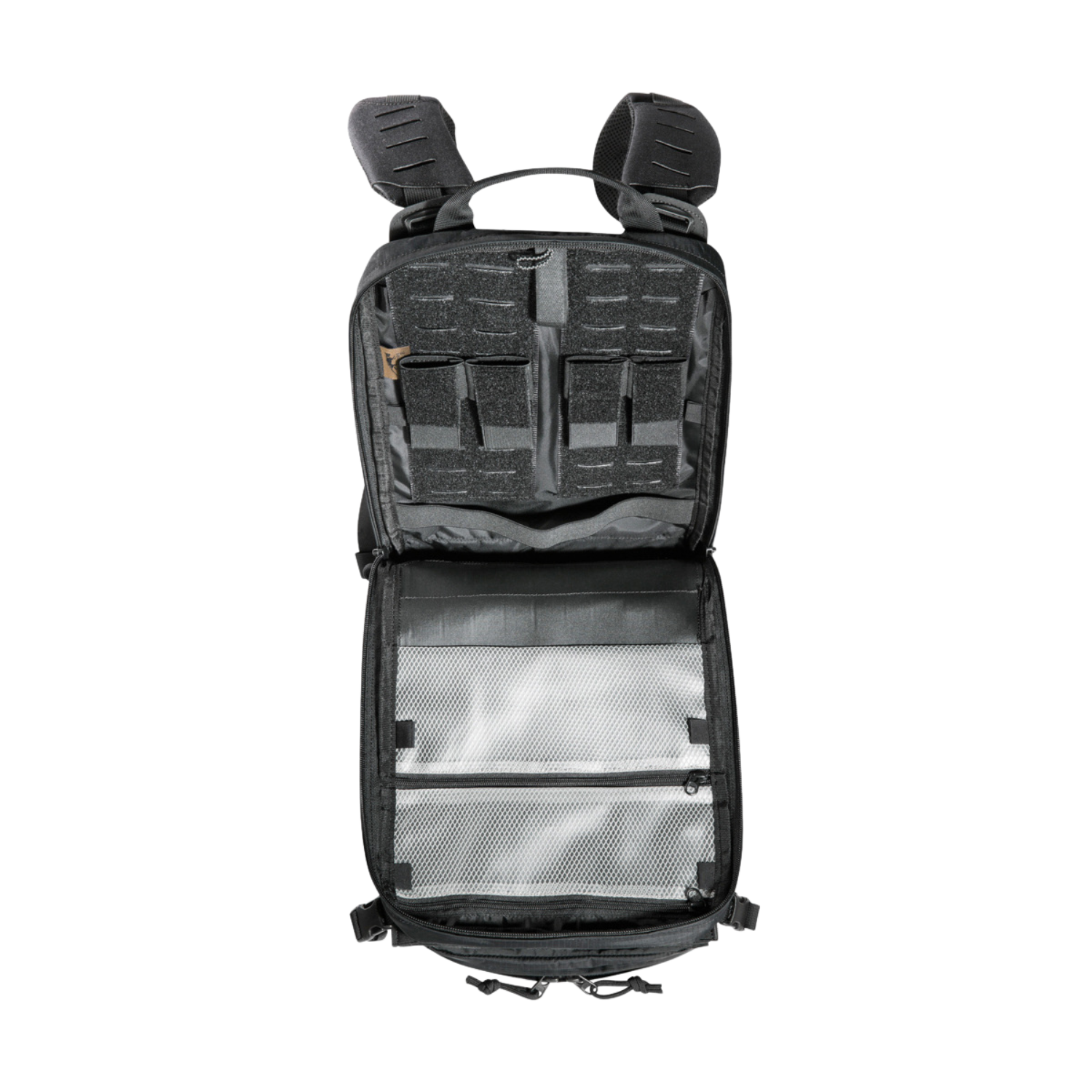 With three front pockets (partially fold-down or detachable), hydration system preparation, MOLLE hook-and-loop and MOLLE reverse system on the back and plate carrier adapter.