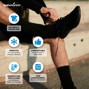 Thanks to its natural moisture-wicking (Thermoregulating) properties, Merino Wool will help regulate your body temperature, keeping you cool in the summer and warm in the winter, so you stay dry and comfortable. Plus its anti-microbial, which means it, will remain odour-free even after multiple consecutive wears. This all helps to ensure you don’t get any blisters from over sweating and no smelly feet!